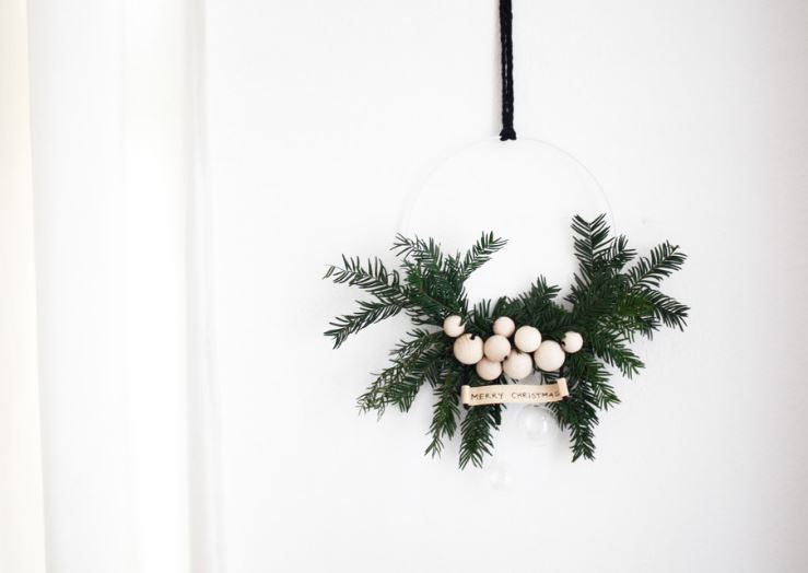 Revisitez la traditionnelle couronne de Noël de manière minimaliste. Fabriquée avec des branches de sapin et des perles de bois, cette version simplifiée s’accorde parfaitement avec les décorations épurées des intérieurs modernes !