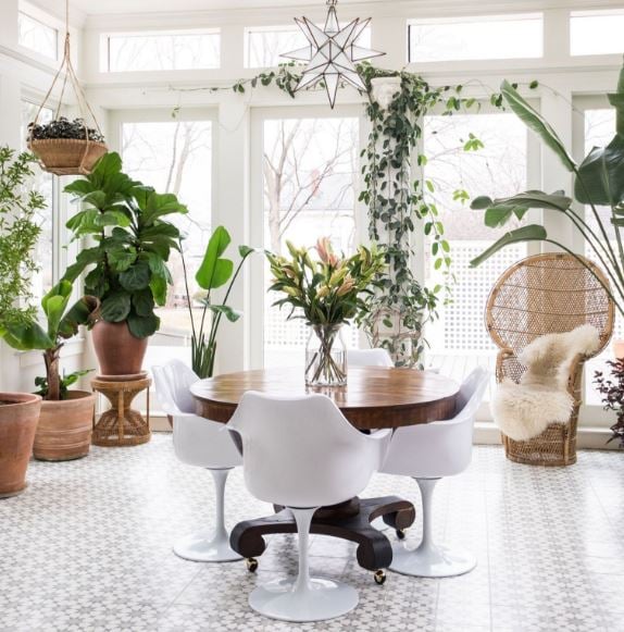 On vous présente ici un salon-salle à manger, habillé tout de blanc et de vert très lumineux. Il occupe un bel espace vitré. Le mobilier, un mix entre contemporain et vintage, est agrémenté de plantes grimpantes et de végétaux en pots. La verdure épanouie sert de décor aux repas. Bienvenue dans un espace zen.