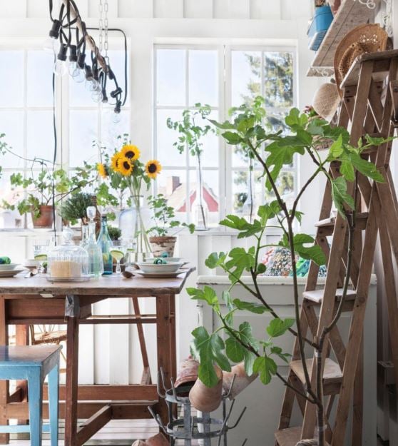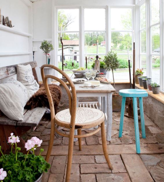 Voici une véranda qui nous séduit beaucoup : bois blanc, avec son sol pavé. La déco joue avec un style campagnard affirmé : vieux banc en bois, pots de fleurs en fer et mobilier chiné. Ce jardin d’hiver est ouvert sur la campagne environnante, forcément, pour parfaire le style avec brio.
